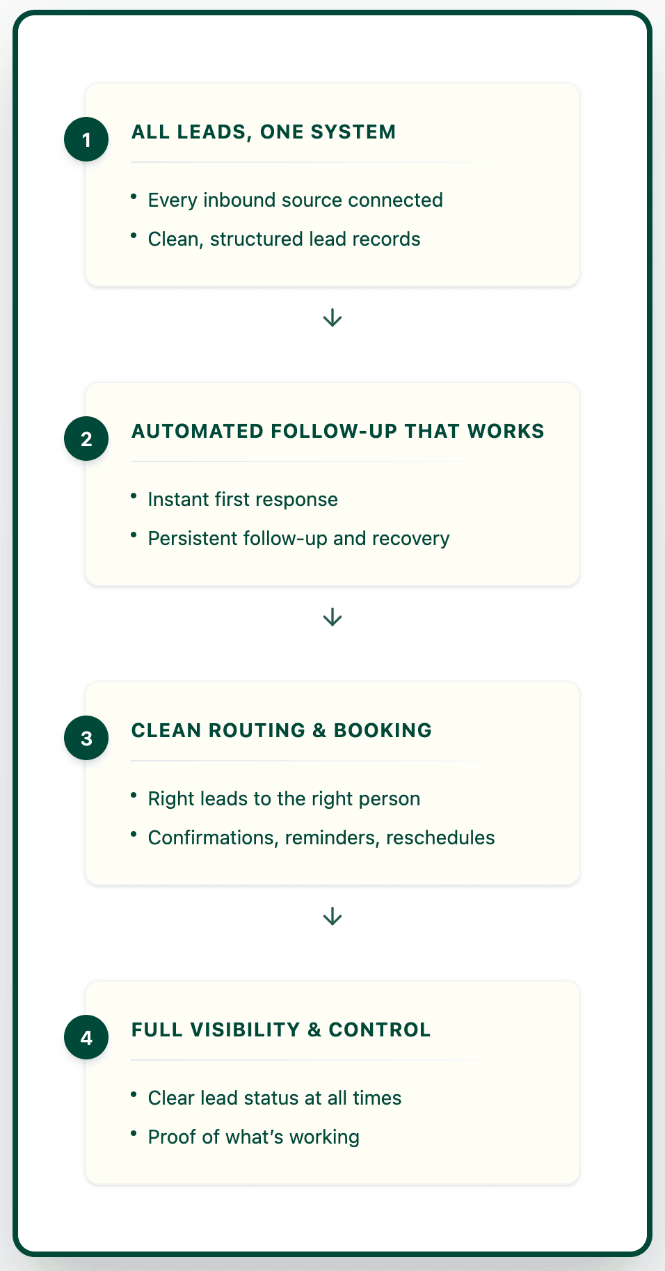All inbound leads — DMs, forms, referrals, calendars — are routed into a single, structured system.